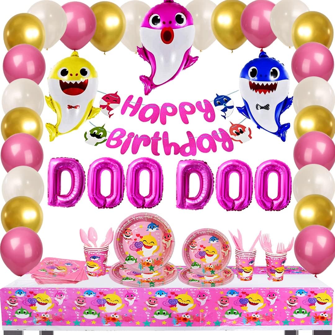 Amazon Com Empire Party Supply Baby Shark Birthday Decorations For Girls Pink Baby Shark Party Supplies Includes Cute Shark Doo Doo Balloons Banner Spoons Knife Forks Plates Napkins Table Cloth All In One Kit Home
